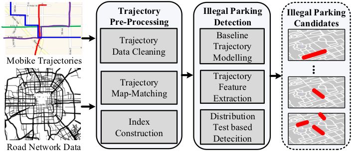 该论文是第一篇基于共享单车的违停检测研究。在无需任何人力的介入下,达成了全城范围的违停检测。设计了针对共享单车轨迹特定的清洗与路网匹配方法,并以此采用了一种轨迹融合与假设检验的违停检测算法。该工作使得可以单独依赖共享单车数据完成大范围的违章停车检测,为解决机动车占道停放等问题提供新思路,并助力城市道路规划的优化和完善,是共享单车数据深度挖掘的一个经典例子。