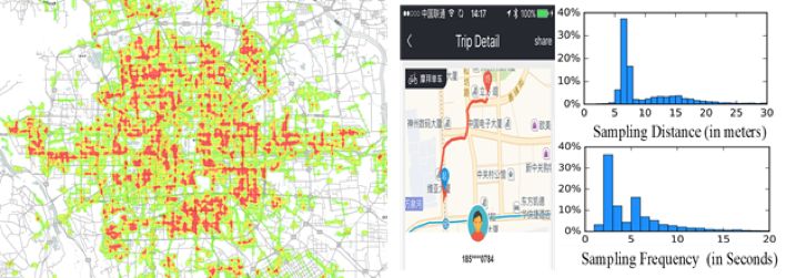 幸运的是,近年共享单车兴起并广受欢迎。以摩拜为例,摩拜单车在北京拥有超过百万的订单。而摩拜单车的用户在使用过程中,记录了大规模、细粒度的非常有价值的轨迹信息。违章停车会对自行车的骑行线路产生影响,使其不同于正常骑行轨迹。如果在某一路段获得了大量模式类似的轨迹,就可以对当前路段是否有违章停车进行推测。