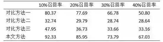 通过参数调节,在相同的召回率下(10%、20%、30%、40%),四种方案的准确率如下: