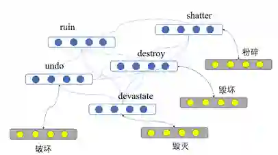 根据集合绘制词对连通图。其中满足吸引约束的词之间用蓝色实线相连,满足同义约束的词之间用黑色双向箭头相连。如下图所示: