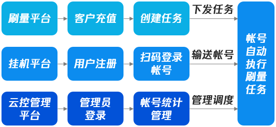 相较于以往的手法,挂机模式的高明之处在于,一方面,平台方无需再购买和维护大量的帐号,而是直接以佣金分成的方式招揽用户、获取帐号;另一方面,用户无需再劳心劳力地抢单接单,亲自执行刷单任务,只需给平台授权帐号使用权即可赚取佣金。本质上,这种模式大量整合了用户帐号资源,各自以不同的方式付出及受益,颇有互联网“共享经济”的痕迹。