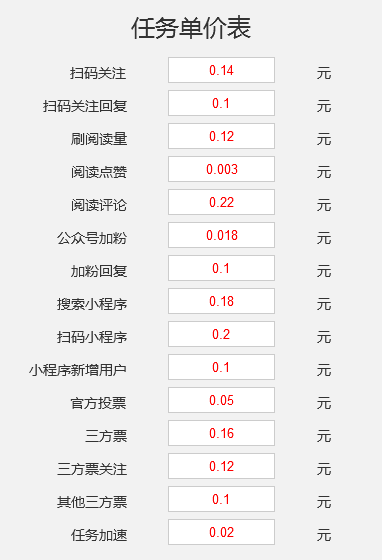 图:平台上各类刷量任务的单价不同,扫码小程序最高,阅读点赞最低