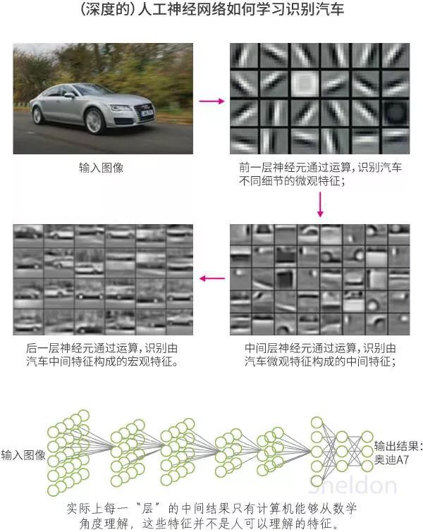 人工神经网络中的神经元看起来很简单,只知道傻傻地将上一层神经元的输入数据进行简单的运算,然后再傻傻地输出。没想到这一套还真的很管用,运用一系列精巧的算法,再给它投喂大量的数据之后,人工神经网络居然能够像人脑的神经网络一样,从复杂的数据中发现一系列“特征”,产生“聪明的思考结果”。