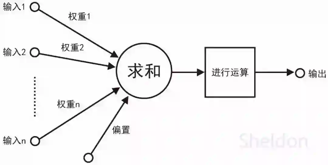 在人工神经网络中,每一个小圆圈都是在模拟一个“神经元”。它能够接收从上一层神经元传来的输入信号(也就是一堆数字);根据不同神经元在它眼中的重要性,分配不同的权重,然后将输入信号按照各自的权重加起来(一堆数字乘以权重的大小,再求和);接着,它将加起来结果代入某个函数(通常是非线性函数),进行运算,得到最终结果;最后,它再将这个结果输出给神经网络中的下一层神经元。