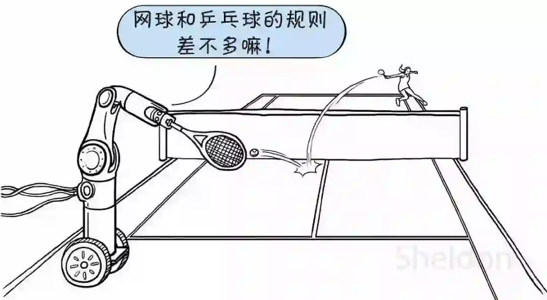 比方说,你让计算机学会了控制机械臂打乒乓球之后,又叫它学习打网球。这个时候,你不需要让计算机从零开始重新学,因为乒乓球和网球的规则是相似的。例如,这两种球都要把球击打到对方的球场/球桌上。所以,计算机可以将之前学到的动作迁移过来。这样一种学习,就叫做迁移学习。