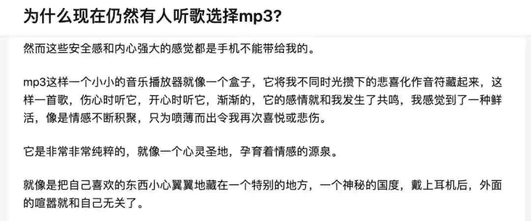 也许不论身处哪个年代,技术如何演进,年轻人对于纯粹的东西的追求都是相同的。这点在MP3上尤为明显,MP3没有花哨的功能,在某一个功能上追求极简,价格适中,对消费能力还不强的00后来说,对于它的怀旧,是因为对朴素功能的怀旧,是因为某种程度上和历史的交集,也是因为囊中羞涩的小小尴尬。
