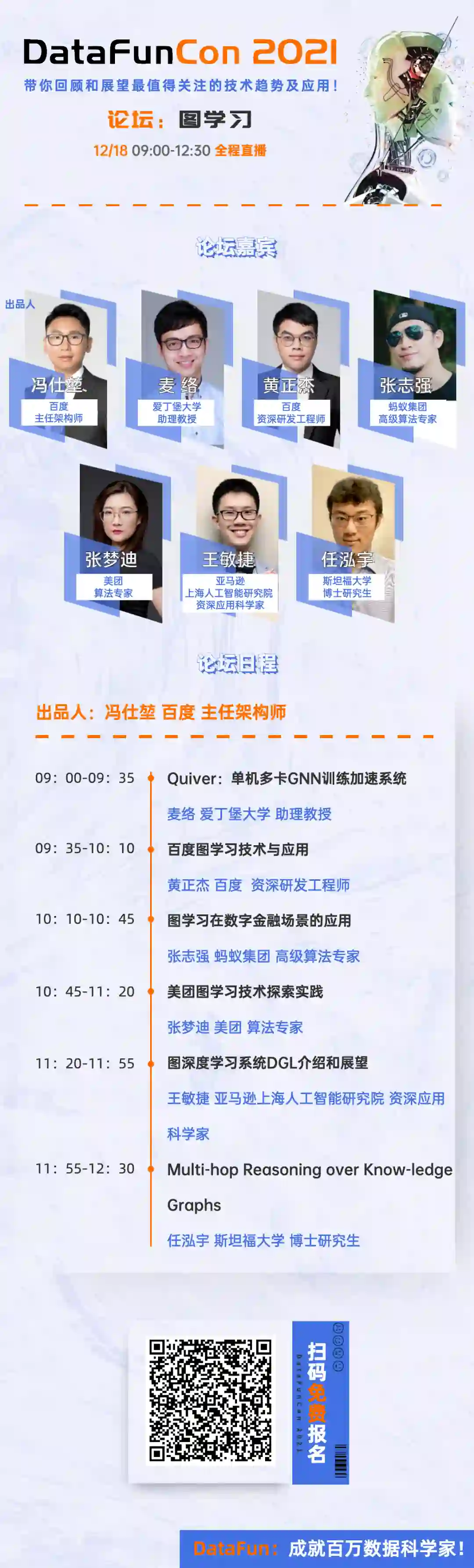 12月18日,9:00-12:30,在DataFunCon大会上,由百度主任架构师冯仕堃老师出品的图学习论坛,将与大家见面,从架构、算法、应用多个维度来全方面阐述图学习技术在学术界和工业界的最新的进展,期待和听众一起总结过去展望未来。