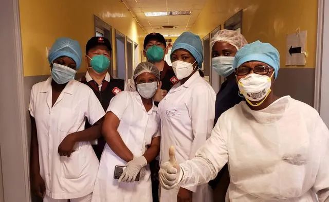 2020年5月26日,中国抗疫医疗专家组在刚果(布)首都布拉柴维尔指导新冠肺炎病房建设时,与当地一线医务人员合影。新华社发