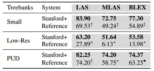 研究者解决了这个问题,并在提交时训练了新的分词器,其中所有超参数都与系统相同。他们进一步构建了一个非官方的评估管道,验证了它与官方系统达到的评估结果相同,并且仅通过替换分词器来评估整个管道。如表 1 所示,由此产生的系统(Stanford+)整体上更准确,分别在官方评估指标 LAS、MLAS 和 BLEX 上排名第 2、第 1 和第 3。在 big-treebanks 上,所有指标仅在 0.02%的 F1 内变化,因此不包括在内。然而,在 small treebanks 上这种影响更为明显:如表 2 所示,校正系统在所有低资源 treebank 的所有官方评估指标上都大大优于所有提交系统。