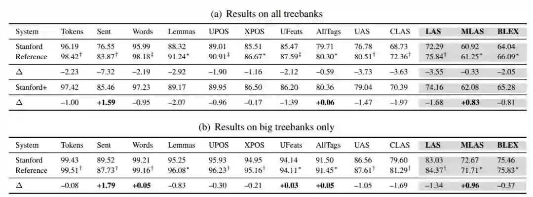 all-treebanks 和 big-treebanks 的结果之间的最大差异来自句子分割。在检查了较小 treebank 上的结果和实现后,研究者注意到标记器中处理数据的方式对这些 treebank 的泛化产生了负面影响。这对于这些 treebank 来说是毁灭性的,因为所有下游组件都在句子水平处理单词。