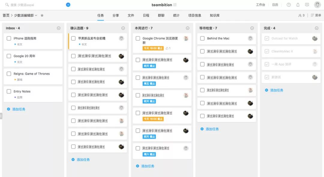Teambition 采用「任务看板」式的界面,将团队任务一目了然地呈现出来。每个任务都是一张灵活的「任务卡」,可以随着项目跟进而拖拽管理。少数派编辑部也在使用 Teambition 进行项目管理和团队协作,你每天读到的文章都在任务看板中经历了一套完整的内容生产流程。