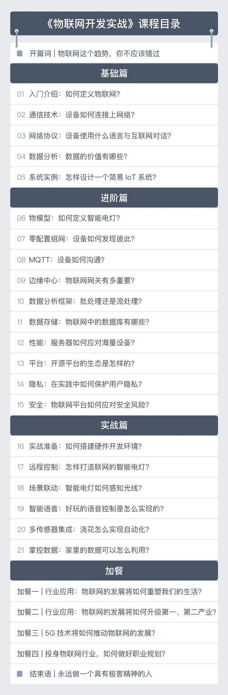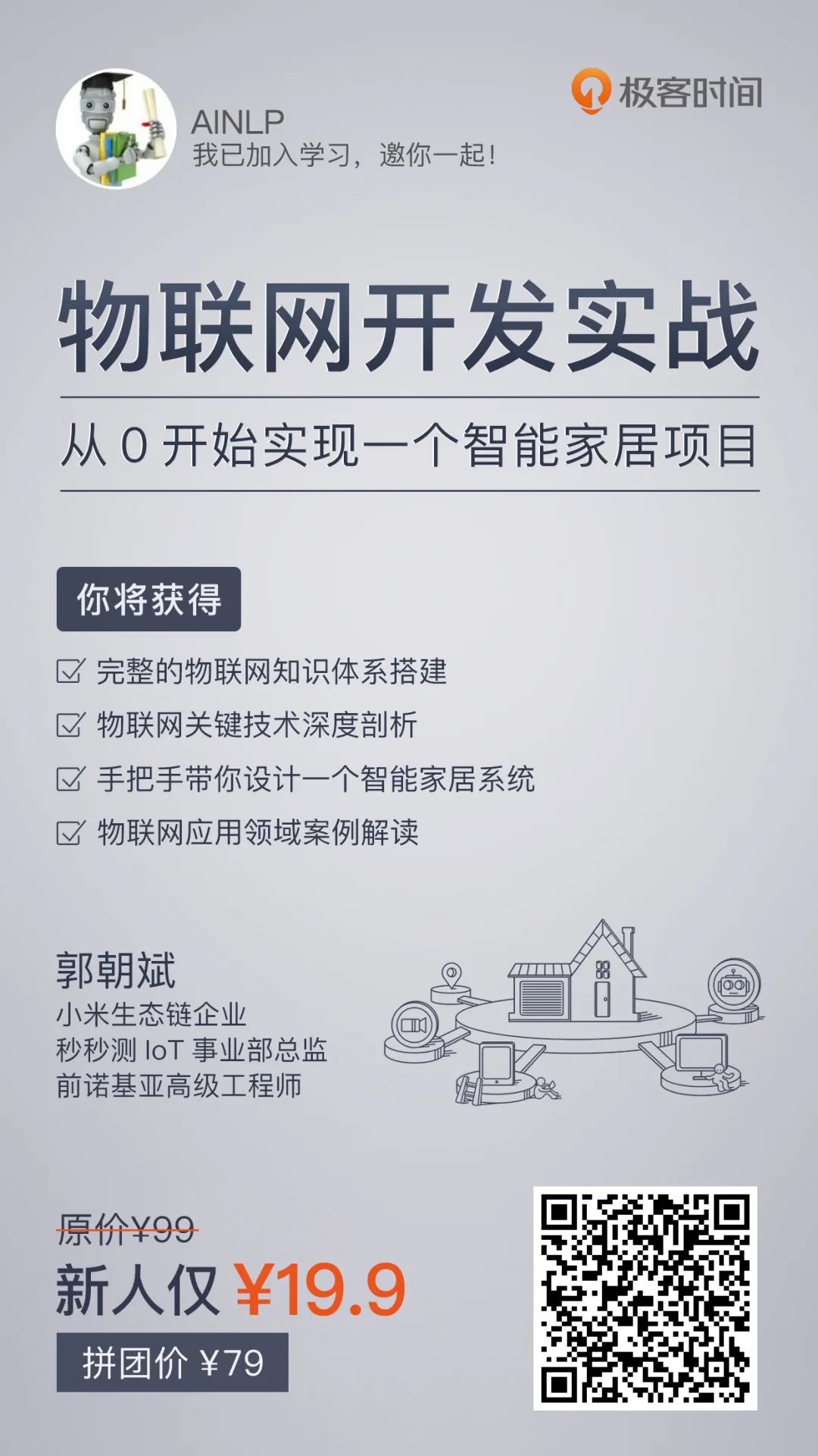 一句话概括的话,就是郭朝斌结合了自己在小米生态的工作经验,梳理出物联网领域庞杂的专业知识、剖析物联网关键技术,带大家从 0 基础开始设计一个智能家居系统。