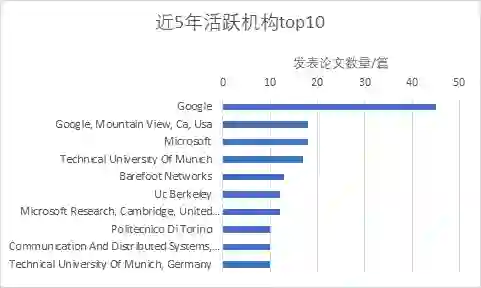 与历史数据来看相反,近 5 年来工业界的投稿热情高涨,在投稿排行前十的机构中,来自工业界的占据了7所,且前三名均为大型科技公司谷歌、谷歌(Moutain View)、微软。谷歌公司以 45 篇论文一骑绝尘。