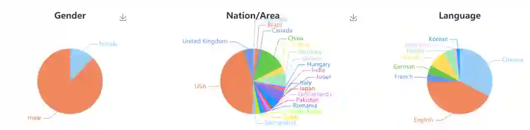根据 AMiner 统计结果,可以看出论文作者以男性为主,约占据了 87%,来自美国的作者最多,占据了 45%,其次是中国,占据了 12%,来自中美的学者依旧超过了全部人数的一半。紧随其后的投稿活跃的国家是德国(6%),以色列(5%),意大利(4%)。