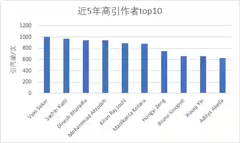 从排名靠前高引作者来看,与机构按投稿数量与引用数量排名变化不大相比,大部分投稿靠前的作者并没有出现在引用量靠前的作者榜单,投稿前十的作者中只有两位同时也是引用量前十的作者,他们分别是来自麻省理工学院的 Mohammad Alizadeh,威斯康星州互联网与系统研究实验室的 Aditya Akella。引用量靠前的作者们引用量差距不大,平均有 800 左右的引用,排名第一的是来自卡耐基梅隆大学的 Vyas Sekar,总计有 1006 次引用。值得注意的是,两名华人作者 Hongy Zeng,Xiaoqi Yin 分别以 748、664 次引用榜上有名!