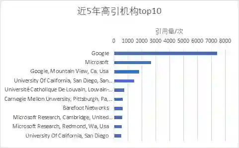 在引用量方面,投稿数靠前的机构如微软谷歌等仍然引用量靠前,而未出现在投稿数量前十榜单的加州大学圣迭戈分校,卡内基梅隆大学异军突起,进入了引用量排名前十。