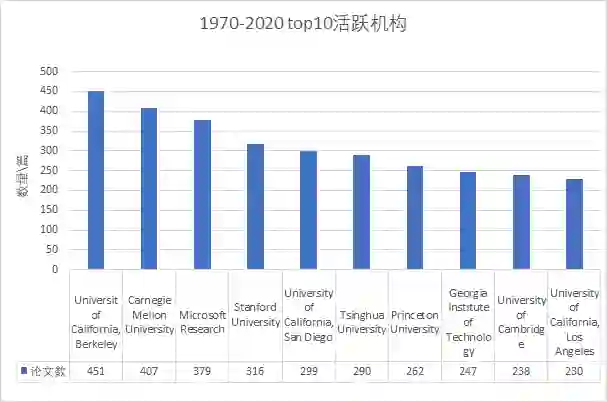 从论文被收录的数量来看,活跃的投稿机构大多来自大学机构,最活跃投稿的机构是加州大学伯克利分校,共计有 451 篇投稿,投稿排名第二第三的分别是卡耐基梅隆大学与微软研究院,微软公司也是唯一进入前十的工业界机构。国内机构只有清华大学以 290 篇论文进入投稿排行榜前十。具体前十榜单见图 1。