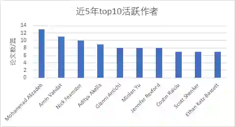 按投稿数来排名,排名前十的作者大多都有 8 篇论文左右的投稿,投稿数最多是来自麻省理工学院的 Mohammad Alizadeh,有 13 篇投稿。第二第三名分别是来自加州大学圣地亚哥分校与普林斯顿大学的 Amin Vahdat(11)及 Nick Feamster(10)。只有一名华人作者 Minlan Yu 进入了前十榜单。