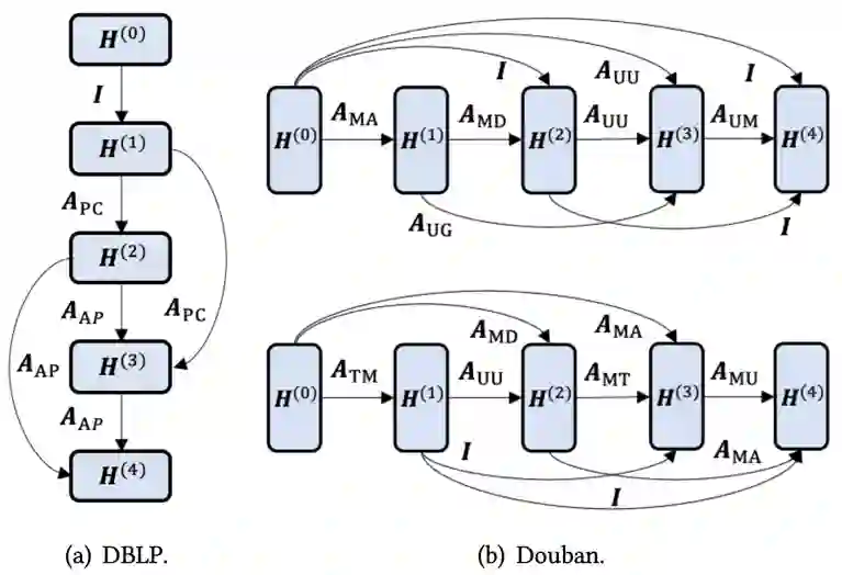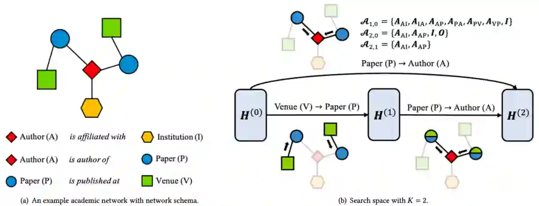 在这篇文章中,我们提出了一种在异质图(Heterogeneous Information Networks (HINs)) [3] 上进行表示学习的新方法。我们的方法受到了神经网络架构搜索(Neural Architecture Search (NAS)) [4] 的启发。NAS 旨在自动地搜索出适应于数据集与下游任务的神经网络结构。对于 HINs,我们希望可以使图神经网络(Graph Neural Networks (GNNs)) [5] 自动地选择利用异质图中与下游任务相关的语义信息。