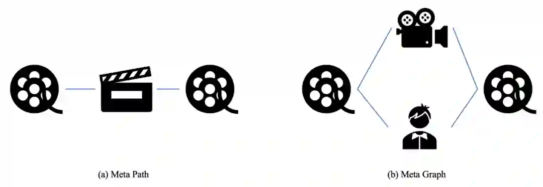 这两个概念是由节点类型和边类型组成的复合关系,以表示 HINs 中的语义信息。例如,图 4(a) 是一个 meta path,表示两部电影有共同的导演,而图 4(b) 是一个 meta graph,表示两部电影不仅有共同的导演,还有相同的演员。