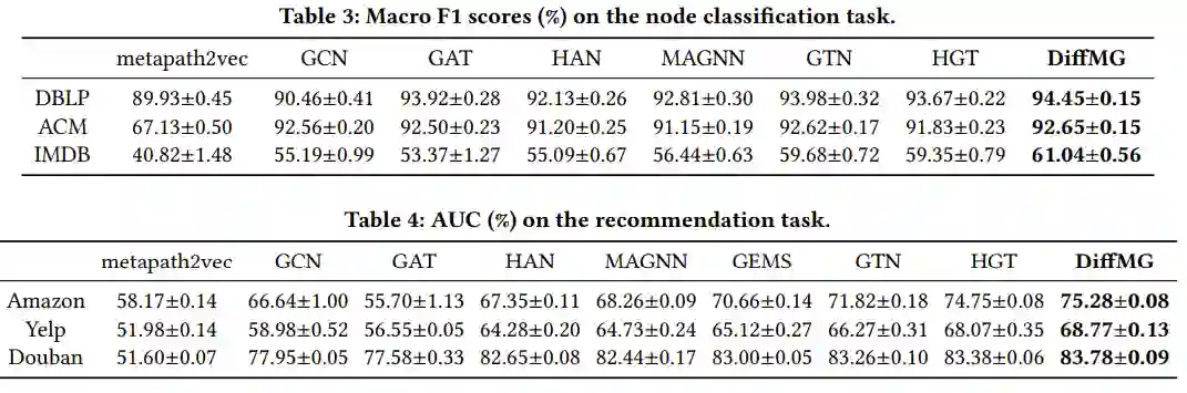 我们在节点分类任务和推荐任务上对我们的方法进行了测试,实验结果表明我们的方法可以取得比现有的为 HINs 设计的 GNNs 更好的效果。