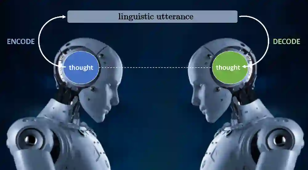 所谓的缺失文本现象(missing text phenomenon, MTP),可以将其理解为 NLP 任务挑战的核心。语言交流的过程如下图所示:说者将思想编码为某种语言表达,然后听者将该语言表达解码为说者意图传达的思想。
