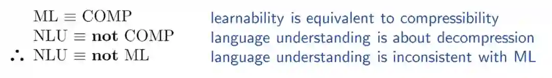 机器学习是将大量数据泛化为单个函数。另一方面,由于 MTP,自然语言理解需要智能的解压缩技术,以发现所有缺失和隐式假设文本。因此,机器学习和语言理解是不相容的——事实上,它们是矛盾的。