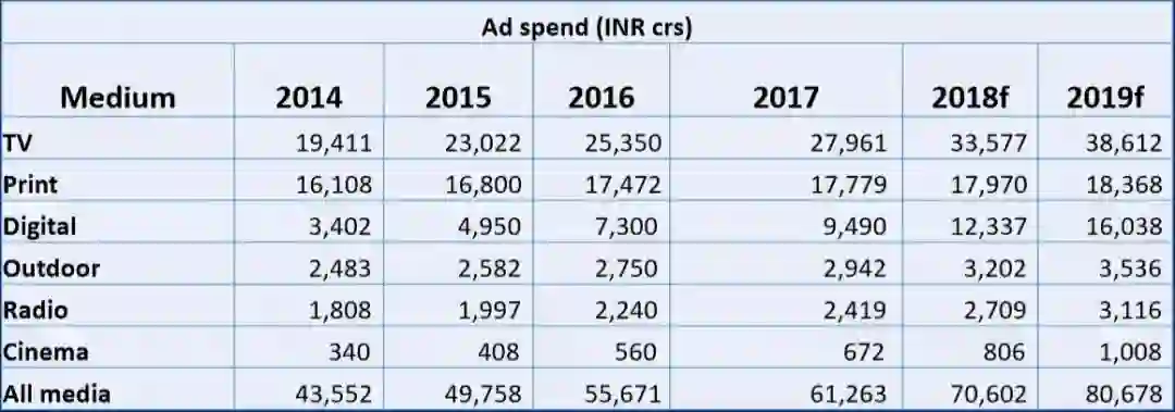 也不难理解,尽管2014-2018是全球智能机急速上升时期,但印度TV广告的份额丝毫没有动摇。