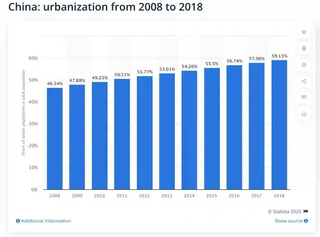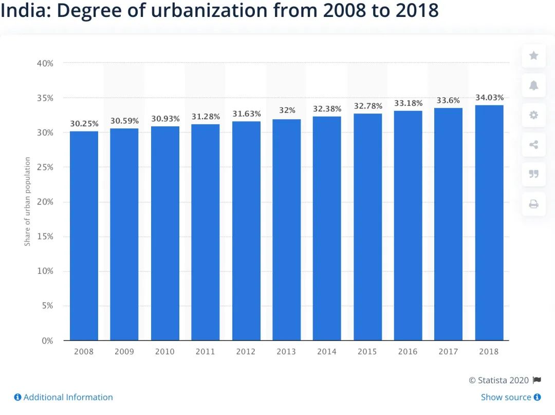 城镇化水平在一定程度上能反应国民购买力,2019年印度城镇人口大约4.7亿,占总人口34.43%。