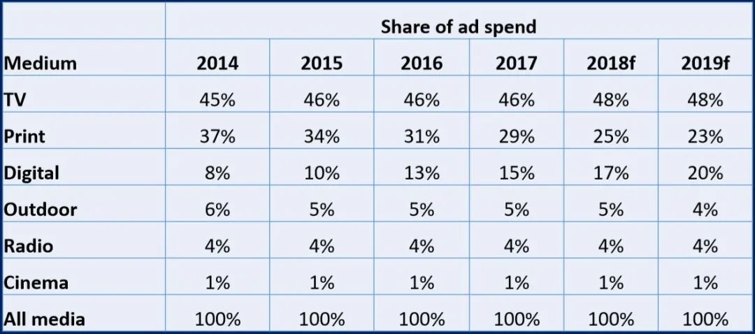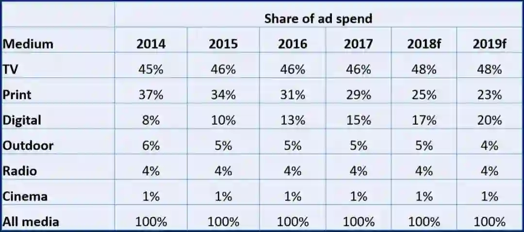 2019年印度广告市场规模大约在100亿美金,电视TV分得近48%,印刷22%,传统媒体广告仍占主导地位。