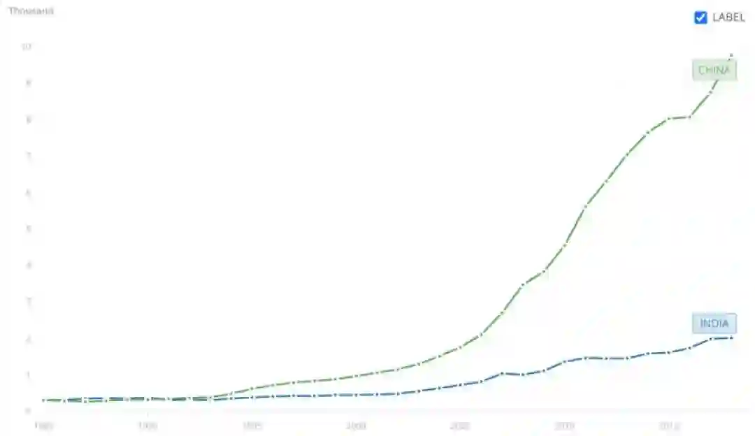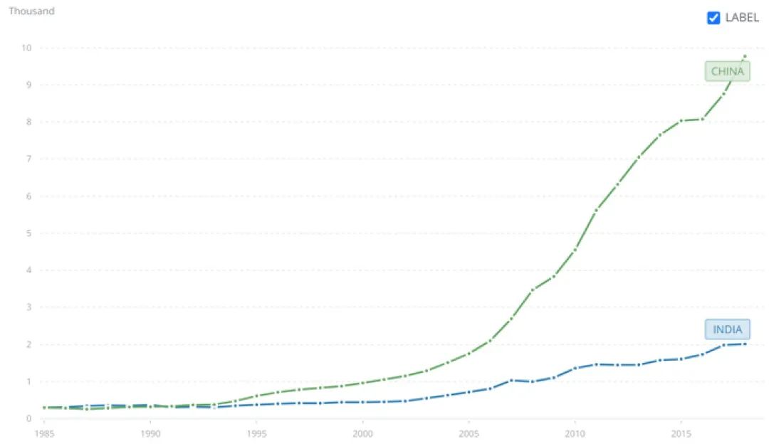 如下是中印GDP增长趋势对比,时间段选取国内移动互联网萌芽至发展成熟的20年。