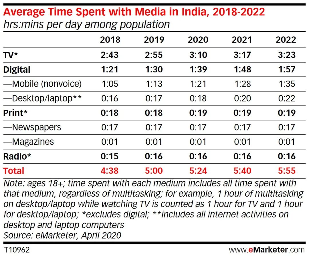 2020年,预计印度成年人平均每天使用传统媒体3小时45分钟,占日常媒体时间的69.5%——数字平台仅占剩余的30.5%,即1小时39分钟。