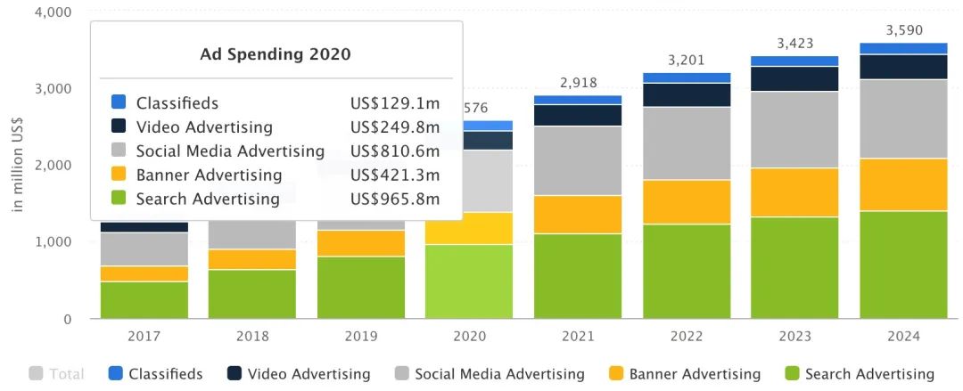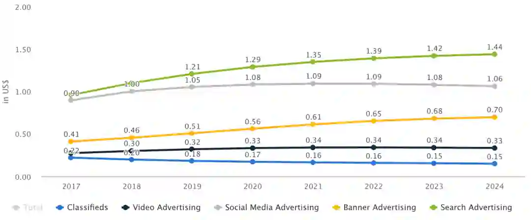 数字广告中搜索广告占比最大。预计2020年市场规模为9.66亿美元。反观现在印度的主流视频广告收入只有2.5亿美金。