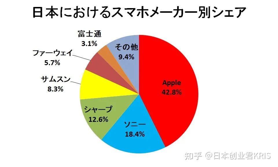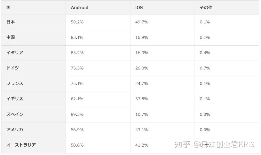 从知乎网友@日本创业君KRIS分析的统计数据来看,在全球多个手机出货量较高的国家中,日本是其中唯一一个安卓和iOS占有率十分接近的国家,也是除美国外iPhone在当地竞争力最强的国家。