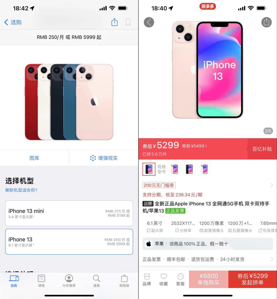 何况国内与国外不同,我们有着更多渠道去购入iPhone,就拿iPhone 13(128G版本)为例,目前官网的价格为5999元,而在第三方平台的价格仅为5299元。