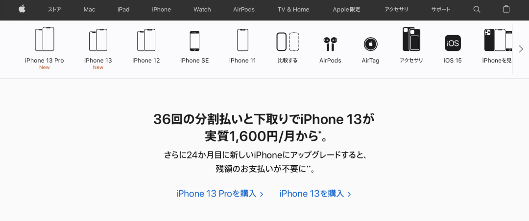 为了验证“每月88元就能购入iPhone 13 mini”的传言,小雷专门打开了日本苹果官网,发现36期免息的宣传甚至排到iPhone宣传页的最上方,足见苹果此次确实有意做宣传。