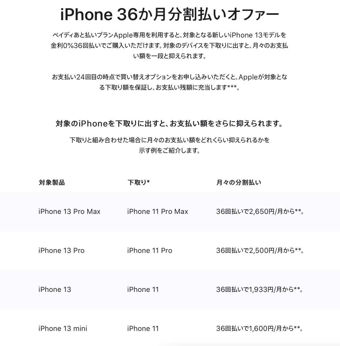 但当小雷打开购买页面,并选择了最便宜的iPhone 13 mini时,却发现就算使用36期免息,每个月也需要交付2411日元(折合人民币132.2元),虽说就差了44元,但也与网上的宣传有一定差距,这到底算不算虚假宣传呢?