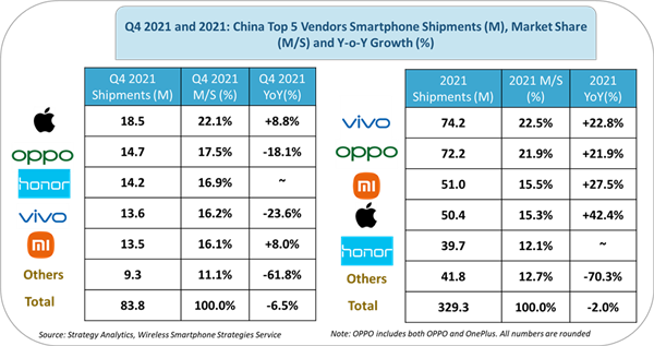 其实从近两年苹果降低iPhone售价、增强产品卖点、 增加分期期数等操作都能看出,苹果如今是真的有点慌张了。根据权威机构数据统计,虽然苹果凭借iPhone 13系列在2021年第四季度登顶国内手机市场,但纵观2021全年,苹果只能排到第四位,不及前三名的vivo、oppo、小米。所以苹果选择下调中国区的iPhone定价、增加分期期数都有利于增加其在中国智能手机市场的竞争力。