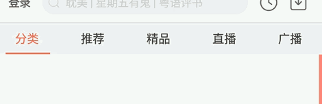 思考:该页面采用顶部的固定搜索栏和swiper内容区俩个模块,俩个模块均可采用绝对定位,搜索栏flex布局,swiper内容区内swiper-item有分类,推荐,精品,直播和广播。