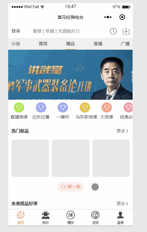 首先,前提,喜马拉雅电台是一个音频分享有声读物的app,由于微信小程序的限制2M,我们这个模块不可能太大,功能也不可能齐全,所以我们要适当的缩减部分功能--->>缩减功能。