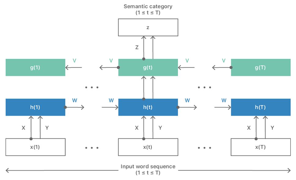 让我们仔细看看该网络是如何运作的。假设当前所考虑的文本块(无论是句子、段落还是整个文档)由 T 个词组成 x(t),1 ≤ t ≤ T,并且与语义类别 z 全局相关。我们把这个文本块作为双向 RNN 架构的输入。