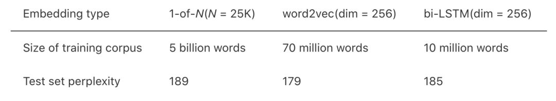 因此我们决定在用于训练 QuickType 预测类型神经语言模型的(句子)语料库的一个子集上训练嵌入。然后,我们在标准语言建模测试数据集上测量嵌入的质量,如表 1 所示。符号「1-of-N」表示我们的标准稀疏嵌入,而「word2vec」表示在大量数据上训练的标准 word2vec 嵌入。