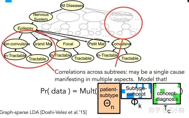 基于稀疏性的方法 主要是利用信息的稀疏性特质,将模型尽可能地简化表示。比如如下图的一种图稀疏性的LDA方法,根据层次性的单词信息形成了层次性的主题表达,这样一些小的主题就可以被更泛化的主题所概括,从而可以使我们更容易理解特定主题所代表的含义。