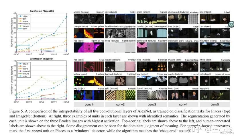 从实验结果中我们也可以发现随着层数的增加,神经网络学到的概念类型也逐渐变得高级,比如在AlexNet中,前面的卷积层对颜色、材质的识别力较强,后面的卷积层对物体、场景的识别力较强。特别是对物体的识别上,后面的卷积层有突出的优势。