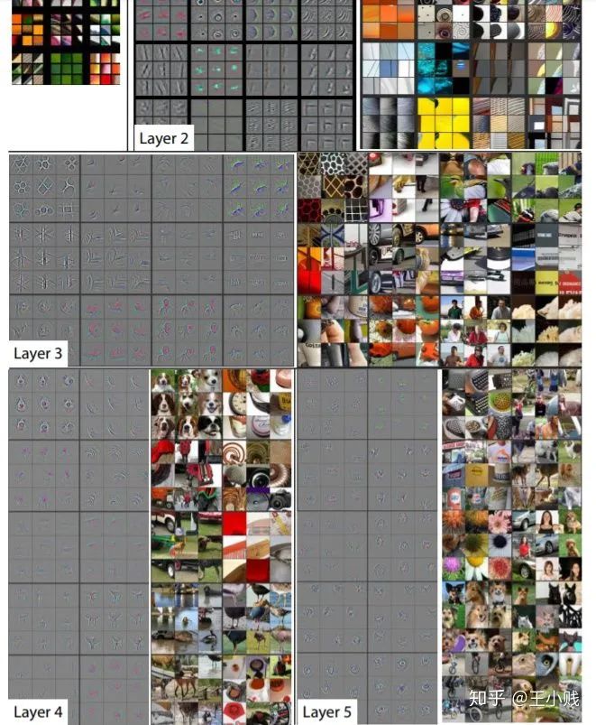 从实验结果可以看出来,第二层对应着一些边角或色彩特征,第三层对应着纹理特征,第四层对应着一些如狗脸、车轮这样的局部部位,第五层则对整体的物体有较强的识别能力。