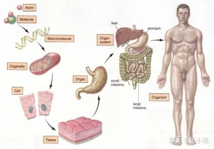 通过上一节的介绍我们也了解到,深度学习的黑箱性主要来源于其高度非线性性质,每个神经元都是由上一层的线性组合再加上一个非线性函数的得到,我们无法像理解线性回归的参数那样通过非常solid的统计学基础假设来理解神经网络中的参数含义及其重要程度、波动范围。但实际上我们是知道这些参数的具体值以及整个训练过程的,所以神经网络模型本身其实并不是一个黑箱,其黑箱性在于我们没办法用人类可以理解的方式理解模型的具体含义和行为 ,而神经网络的一个非常好的性质在于神经元的分层组合形式,这让我们可以用物质组成的视角来理解神经网络的运作方式。比如如下图所示,人体的组成过程是从分子-细胞-组织-器官-系统-人体: