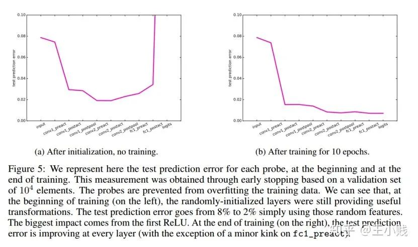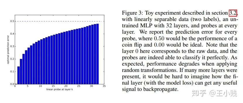 对于神经网络来说,隐层的数量永远都是一个玄学,我们如何理解隐层的数量和模型性能之间的关系呢?Bengio在2016年还做过一个工作《Understanding intermediate layers using linear classifier probes》 。这篇文章的思路非常简单,就是通过在每个隐层中添加一个线性探针来测试隐层的表征性能。什么是线性探针呢?也很简单,就是以每个隐藏层为输入,判别的label为输出建立一个逻辑回归模型,通过评估模型的准确率我们就能得到隐层在整个训练过程中以及训练结束之后表征性能的变化。