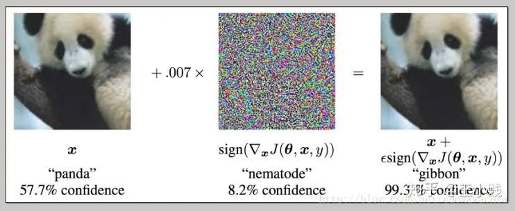 不可解释同样也意味着危险 ,事实上很多领域对深度学习模型应用的顾虑除了模型本身无法给出足够的信息之外,也有或多或少关于安全性 的考虑。比如,下面一个非常经典的关于对抗样本的例子,对于一个CNN模型,在熊猫的图片中添加了一些噪声之后却以99.3%的概率被判定为长臂猿。