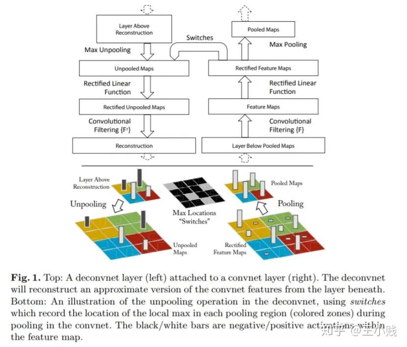 往往可以表示为卷积层对输入层的梯度 ,也就是说通过对卷积层进行适当的补0操作,再用原始的卷积核转置之后的卷积核进行卷积操作,就可以得到相应的梯度矩阵与当前卷积层的乘积,而我们在这里使用反池化-反激活之后的特征(其中包含了大部分为0的数值)进行该操作其实表征了原始输入对池化之后的特征的影响 ,因为在反激活过程中保证了所有值非负因此反卷积的过程中符号不会发生改变。