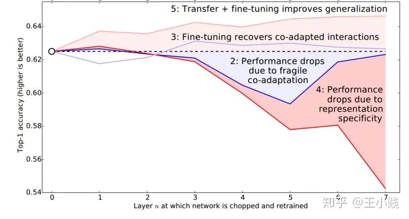 当然从低级概念到高级概念的一个过程中总是会伴随着一个非常有意思的现象:泛化性逐渐降低,特化性逐渐升高。比如在细胞层次上,人类和其他动物的区别比较小,这个层次的泛化性就高,但到组织器官层次区别就比较大,这个层次的特化性就高。Bengio团队在2014年发表的一篇工作《How transferable are features in deep neural networks》 就是通过研究特征的可迁移性来对这个从泛化的特化的过程进行评估。